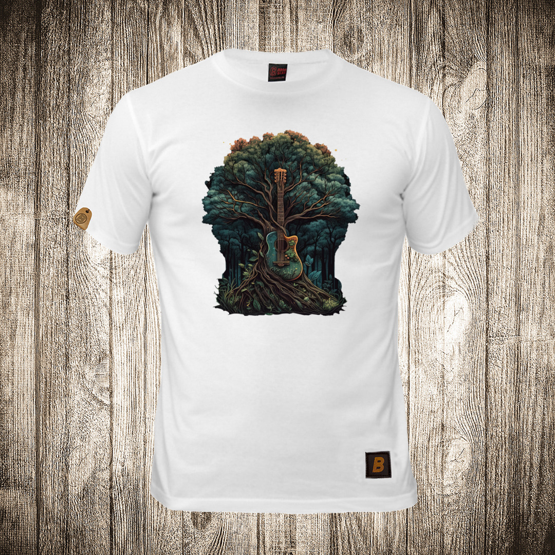 muska majica boja bela slika gitara i drvo muzika