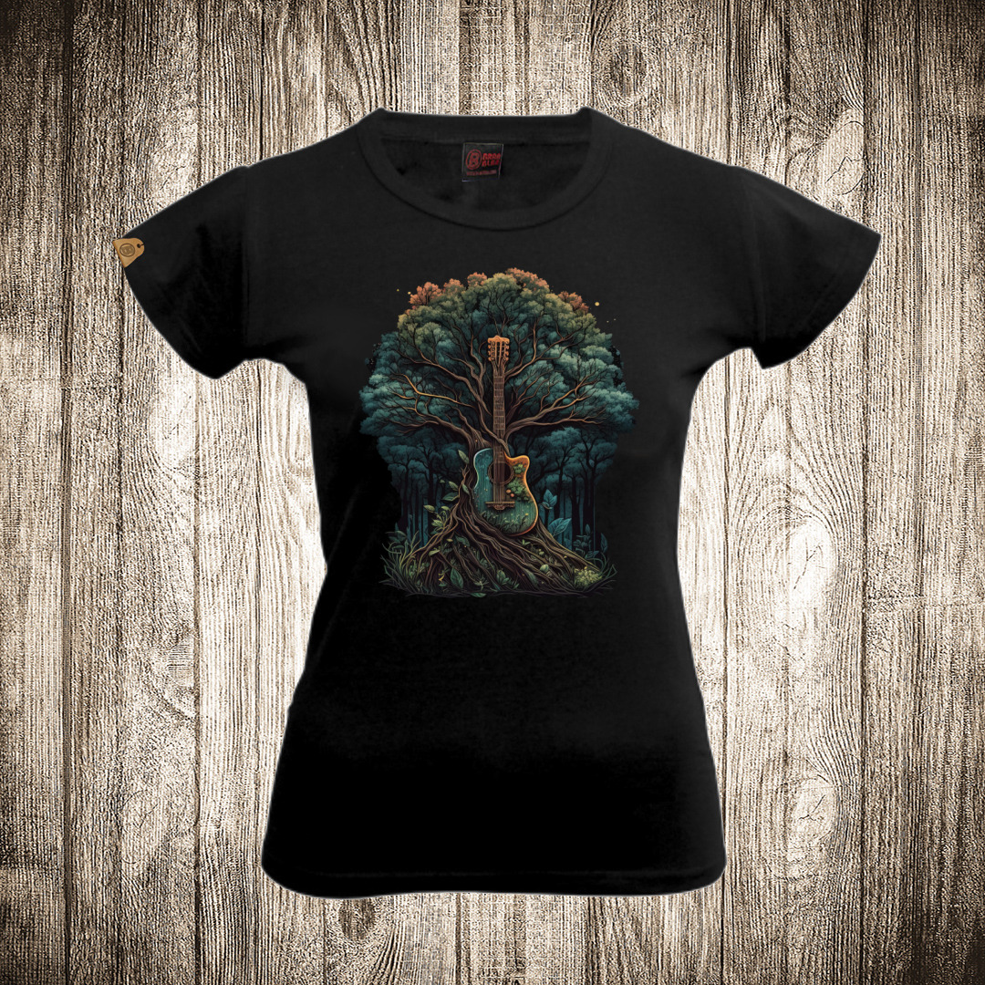 zenska majica boja crna slika gitara i drvo muzika